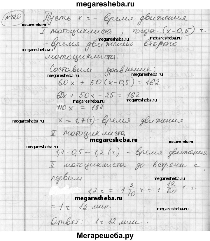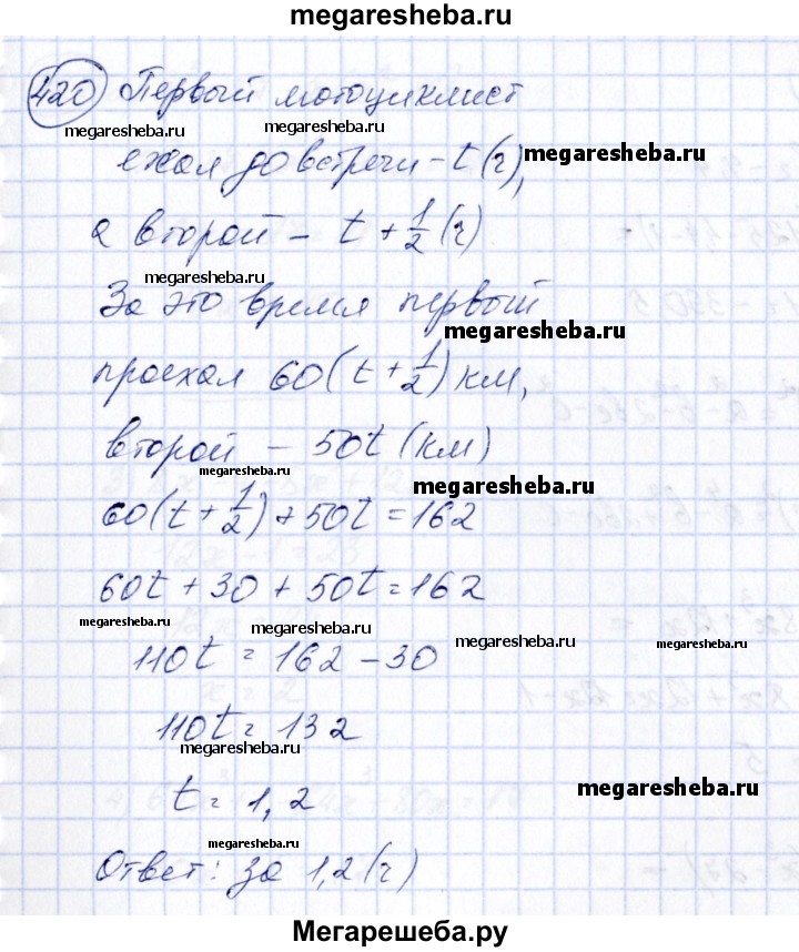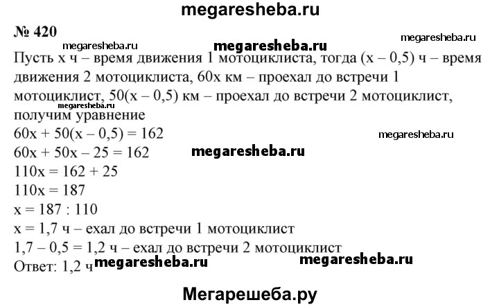 420. Из города в поселок выехал мотоциклист со скоростью 60 км/ч. Через полчаса навстречу ему из поселка выехал другой мотоциклист со скоростью 50 км/ч. Сколько времени ехал второй мотоциклист до встречи с первым, если расстояние между поселком и городом равно 162 км?