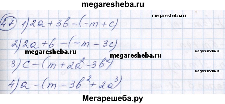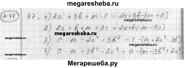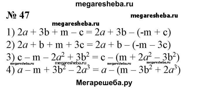 47. Заключить в скобки все слагаемые, начиная с числа то или (-m), поставив перед скобками знак «-»: 1) 2а + Зb + m-с; 2) 2а+b +m + Зс; 3) с-m-2а2 + Зb2; 4) а-m + Зb2 - 2а3 .