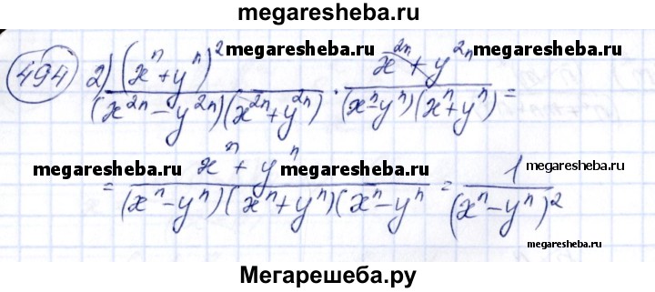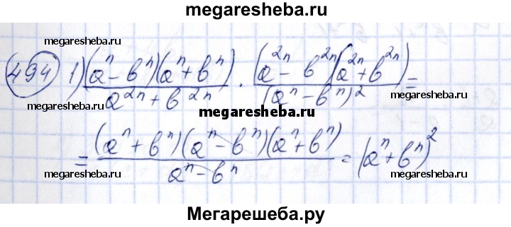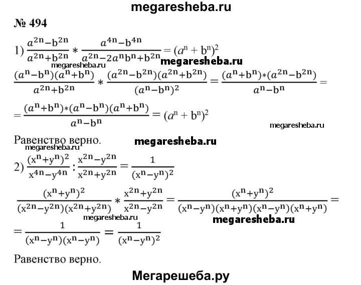 494 Доказать, что при всех допустимых значениях а, b, х и у (n — натуральное число) верно равенство.