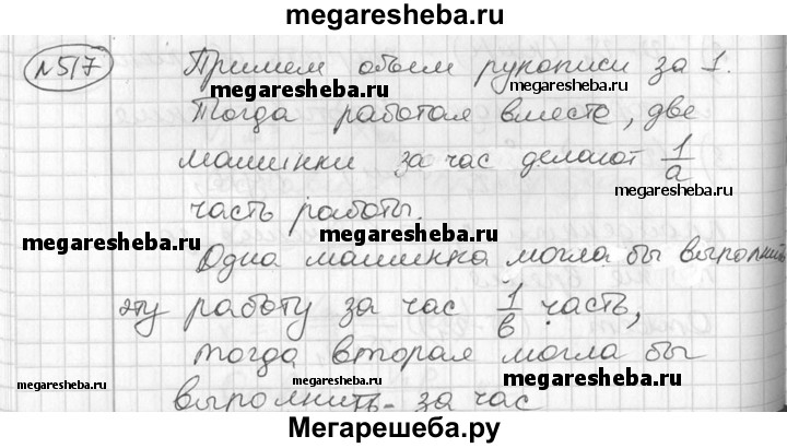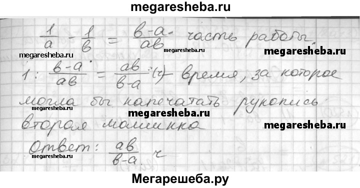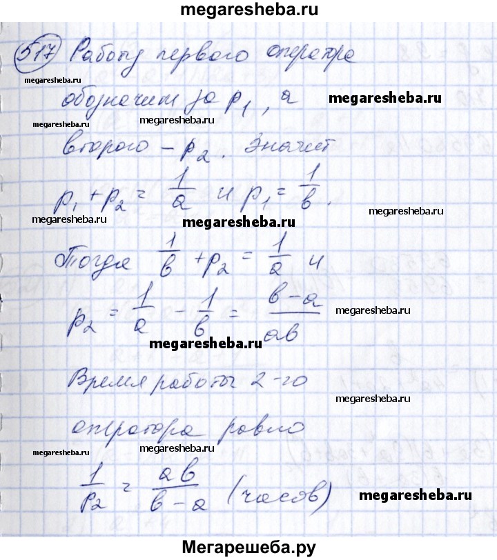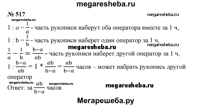 517 Две машинистки, работая вместе, напечатали рукопись за а часов. Одна из них могла бы выполнить эту работу за Ь часов. За какое время могла бы напечатать рукопись другая машинистка?