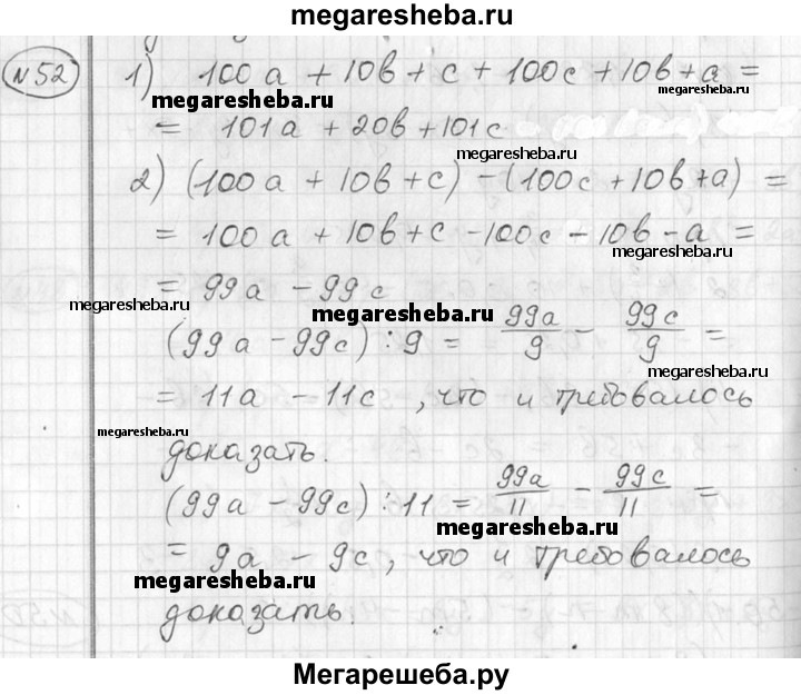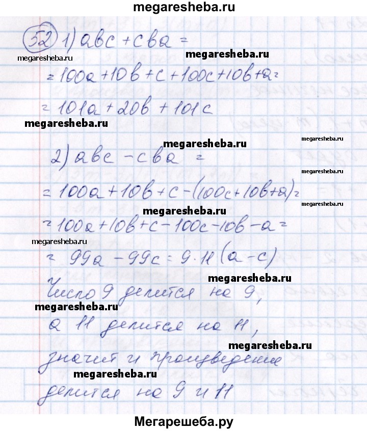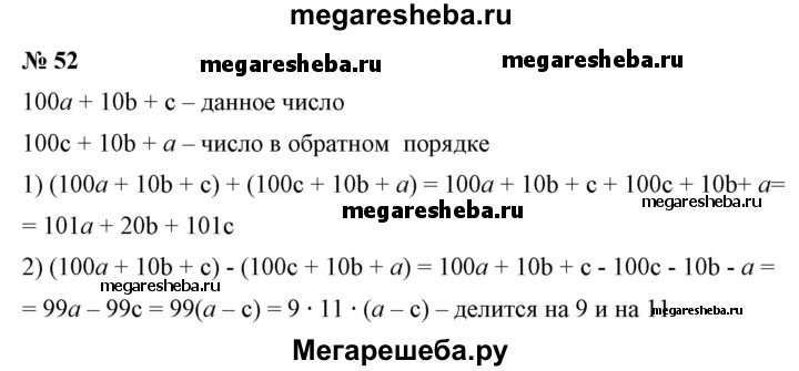 52. В трехзначном числе содержится а сотен, b десятков и с единиц. 1) Составить и упростить сумму данного числа и числа, записанного теми же цифрами, но взятыми в обратном порядке. 2) Составить разность данного числа и числа, записанного теми же цифрами, но в обратном порядке. Доказать, что полученная разность делится на 9 и на 11.