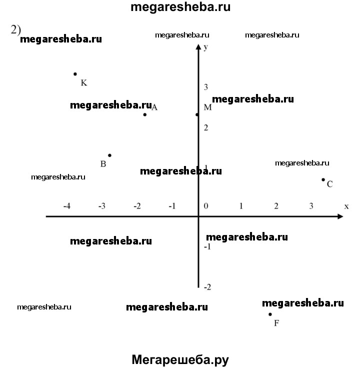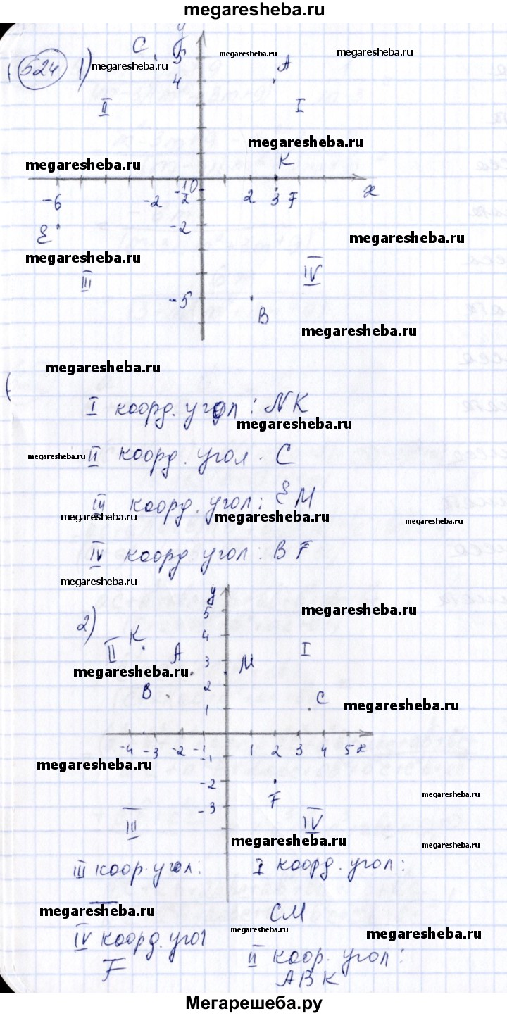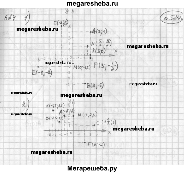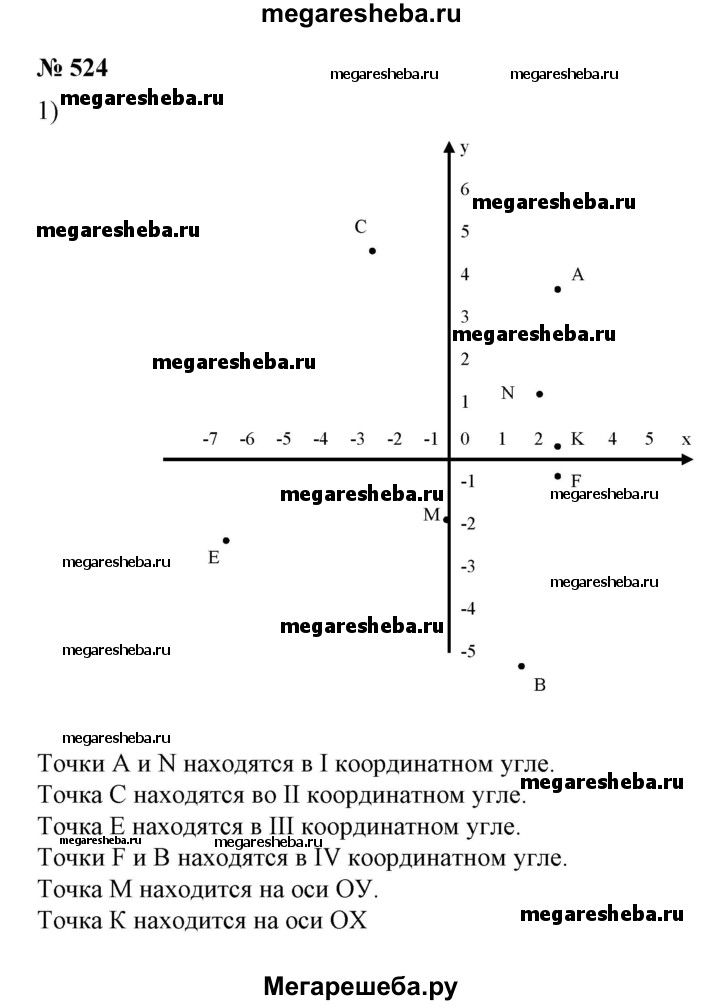 524 Построить точки и указать, каким координатным углам они принадлежат: 1) А (3; 4), В (2; -5), С (-2; 5), Е (-6; -2), F (3; -1/3); К( 3; 0), М (0; -1,5), N(5/2; 3/2) 2) А(-1,5; 2,5), В(-2,5; 1,5), С(3 1/2), F(2; -2), K (-3,5; 3,5), M(0; 2,5).
