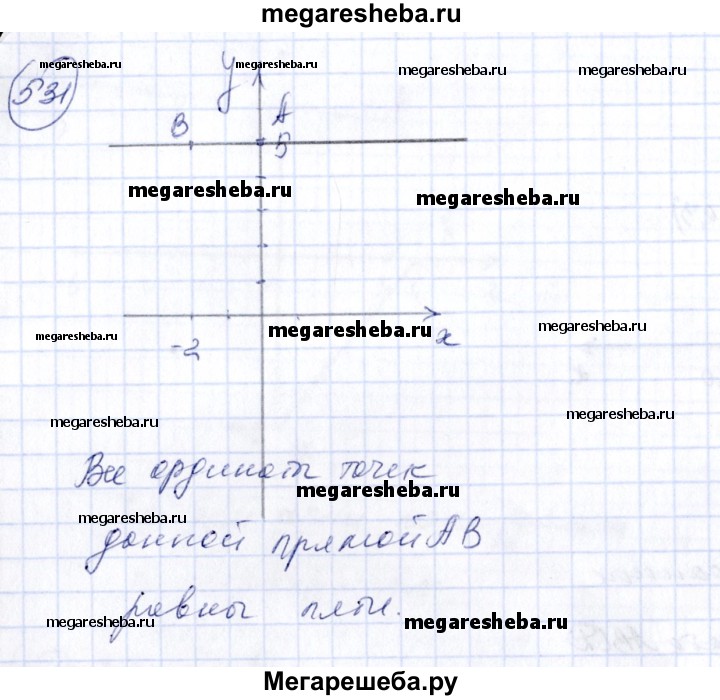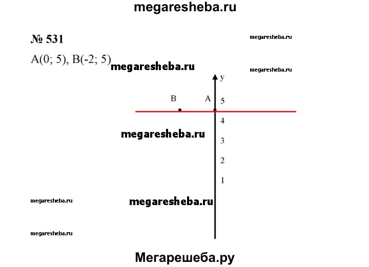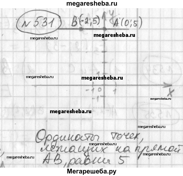 531 Построить прямую, проходящую через точки А (0; 5) и В (-2; 5). Чему равны ординаты точек, лежащих на прямой АВ?