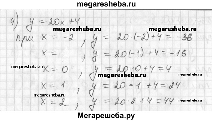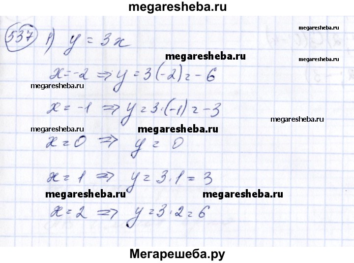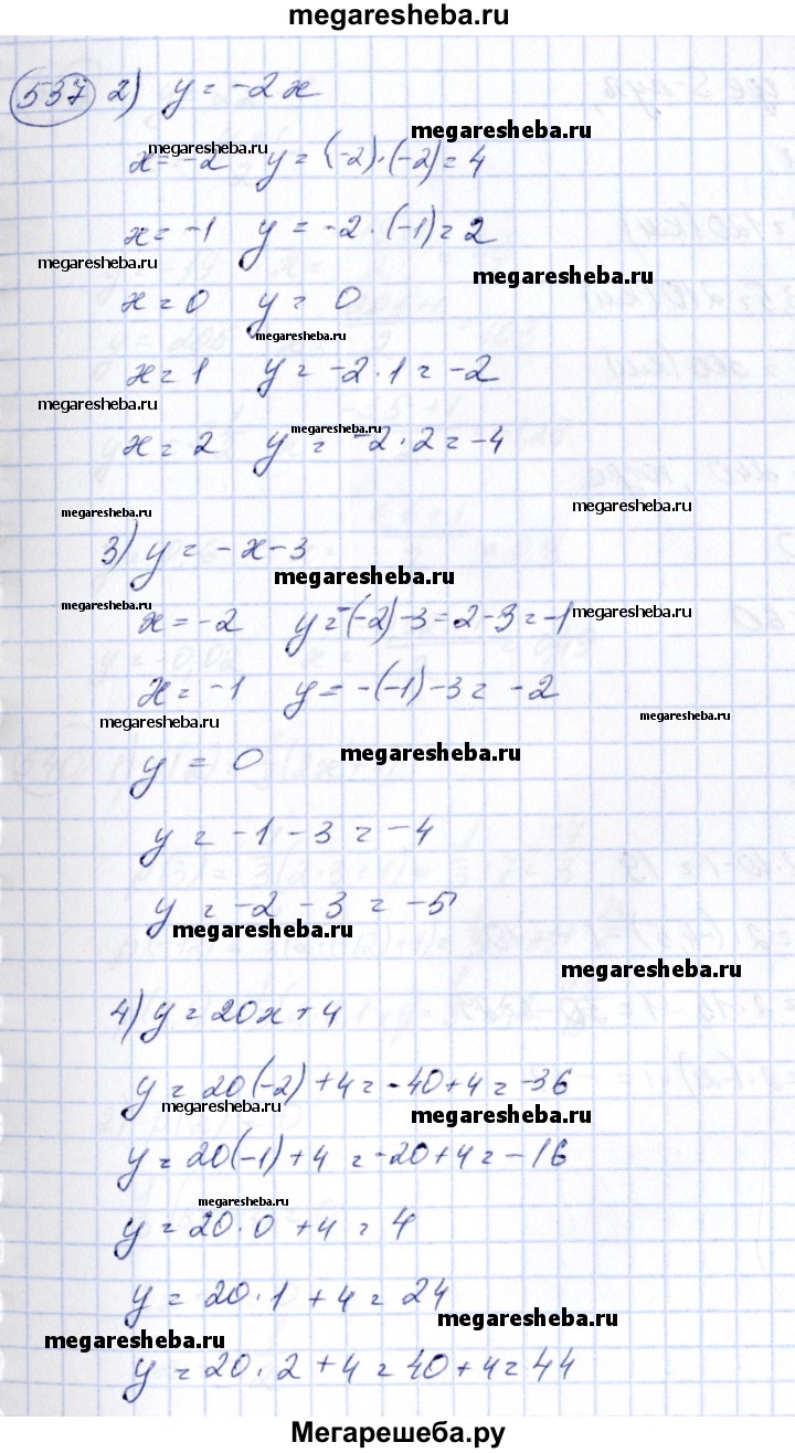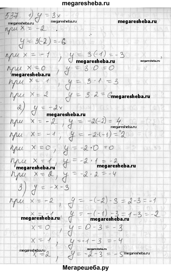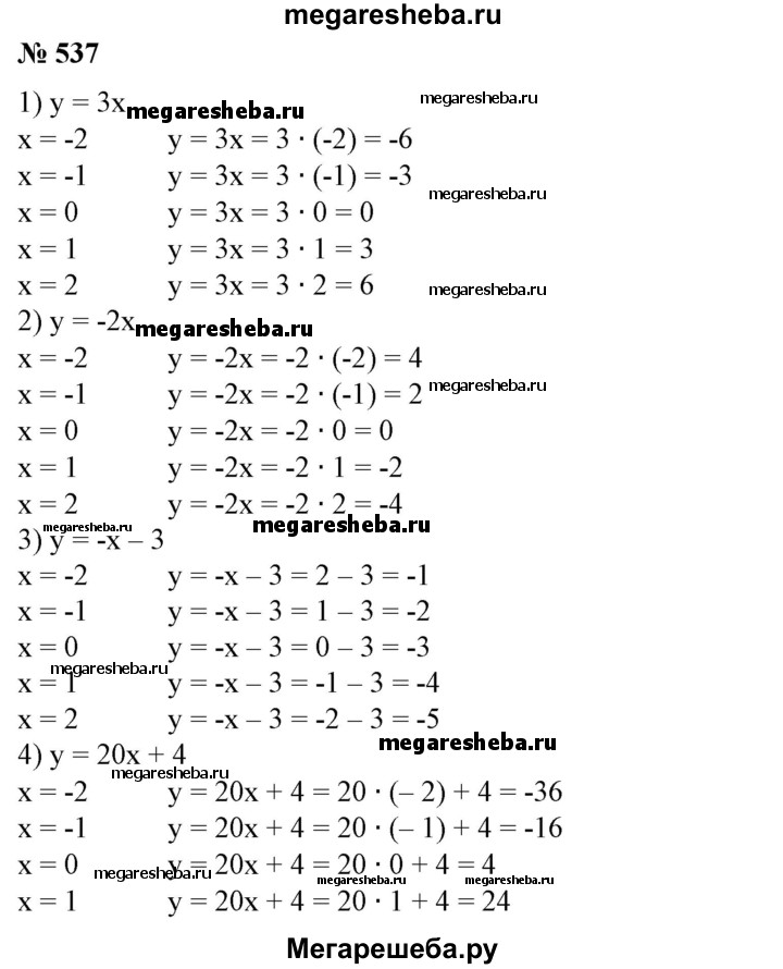 537 Вычислить значение у при х, равном -2; —1; 0; 1; 2: 1) у = Зх; 2) у = -2х; 3) у = -x-3; 4) у = 20х + 4.