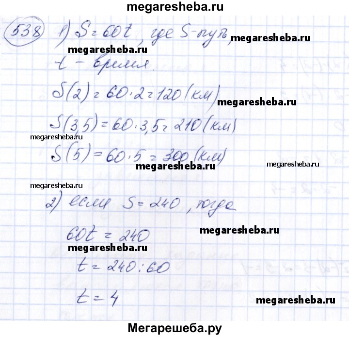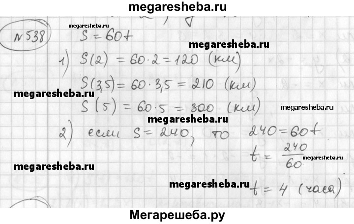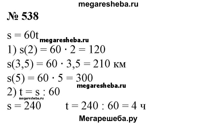 538 Функция задана формулой s =601, где s — путь (в км) и t — время (в ч). 1) Определить s (2), s (3,5), s (5). 2) Определить t, если s=240.