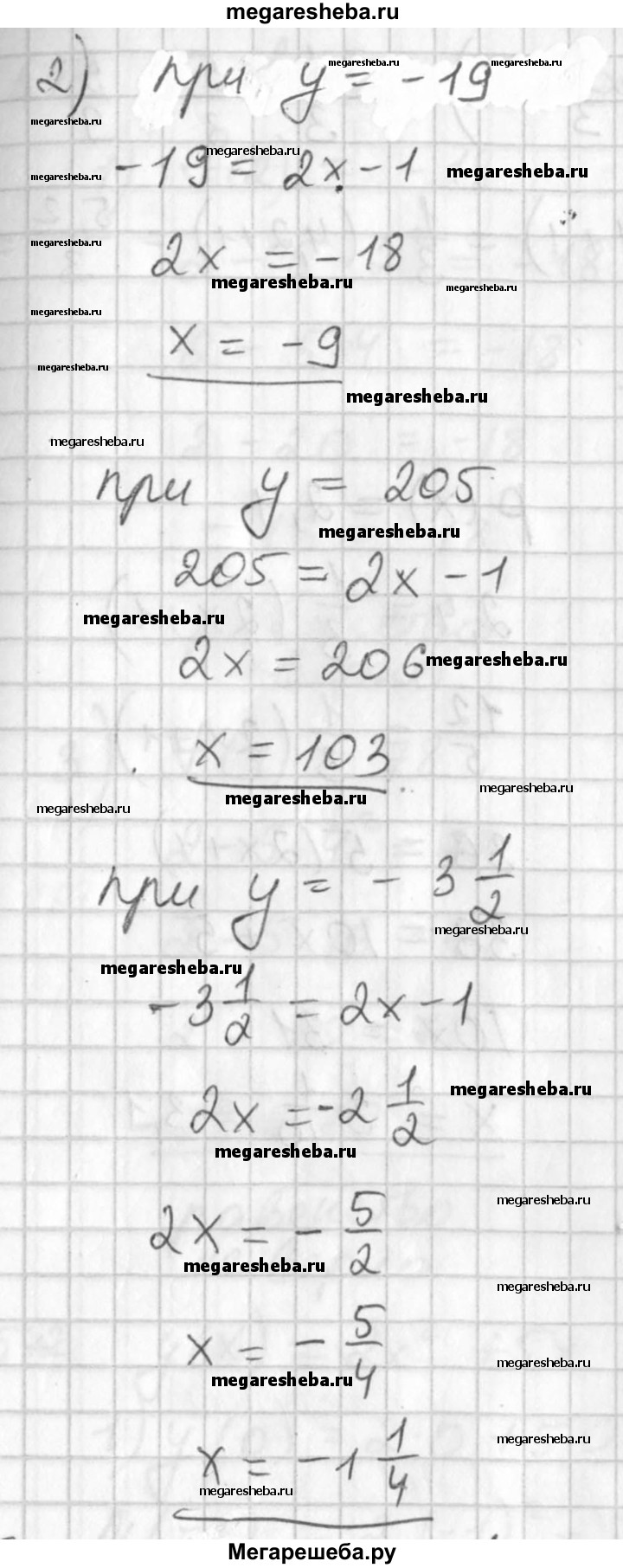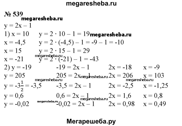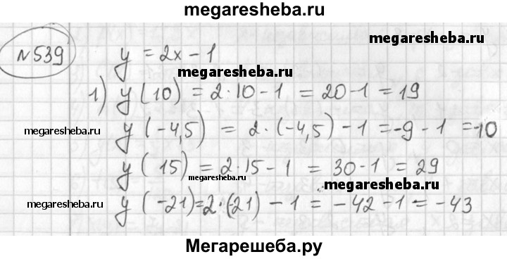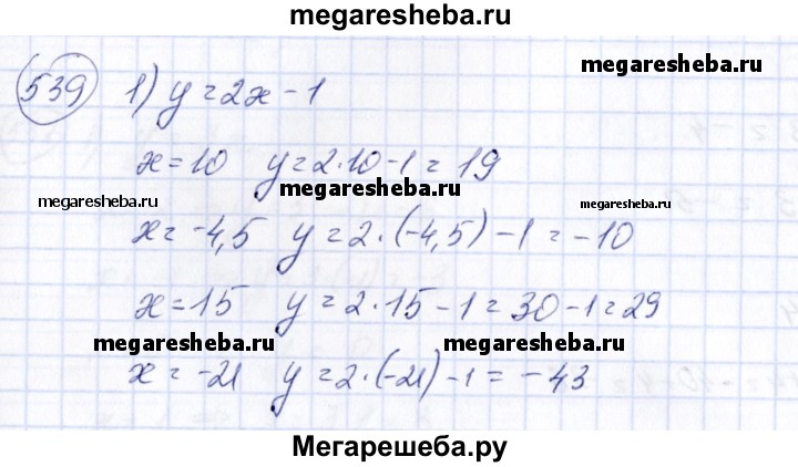 539 Функция задана формулой у = 2х-1. 1) Вычислить значение у при х, равном 10; -4,5; 15; -21. 2) Найти значение х, при котором значение у равно -19; 205; -3 1/2?
