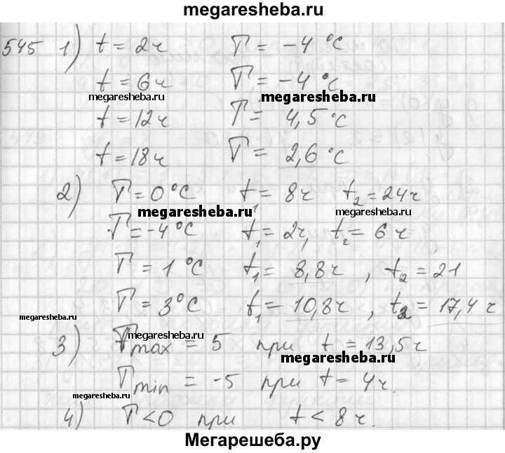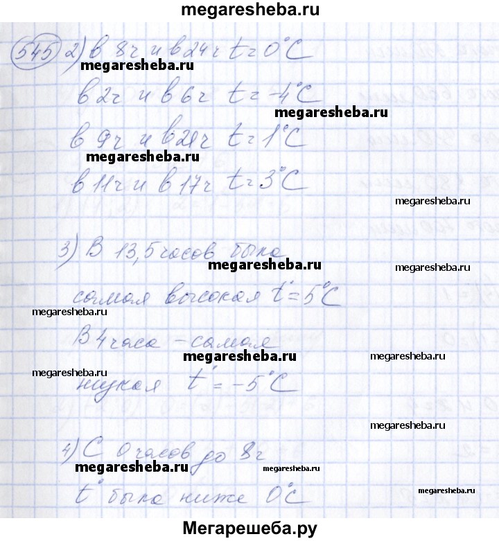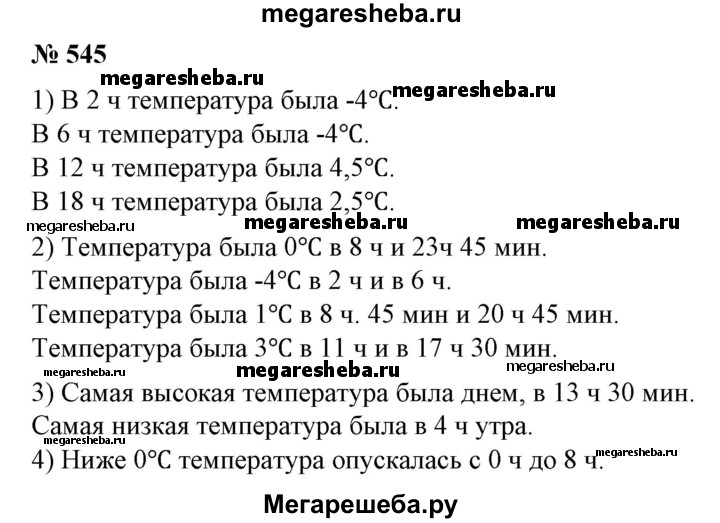 545. На рисунке 11 изобраен график изменения температуры воздуха в теченение суток. 1) По графику найти темпетуру воздуха в 2ч, 6 ч, 12ч, 18ч. 2) В какое время суток температура воздуха равна 0⁰С, -4⁰С, 1⁰С, 3⁰С? 3) В какое время суток температура была самой высокой? самой низкой? 4) В какое время суток температура опускалась ниже 0 °С?