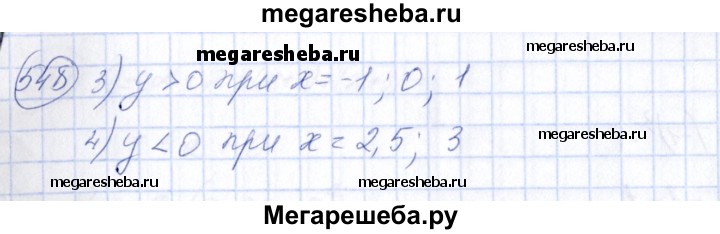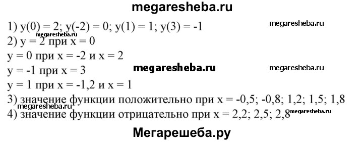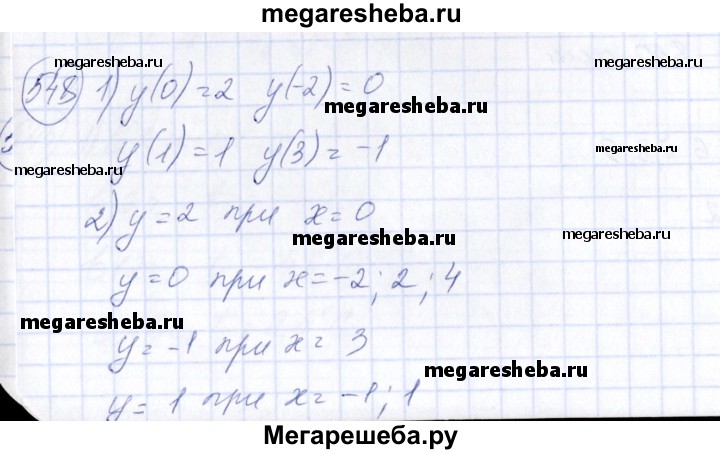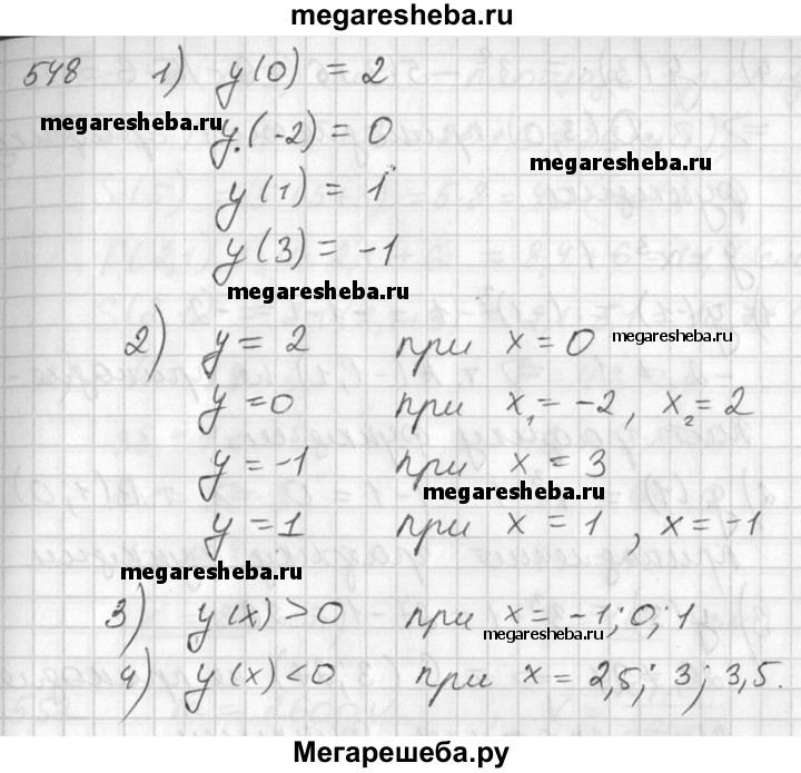 548 Функция у(х) задана графиком. 1) Найти у(0), у(-2), у (1), у(3). 2) При каком значении х значение функции равно 2, 0, -1, 1? 3) Назвать несколько значений х, при которых значение функции положительно. 4) Назвать несколько значений х, при которых значение функции отрицательно.