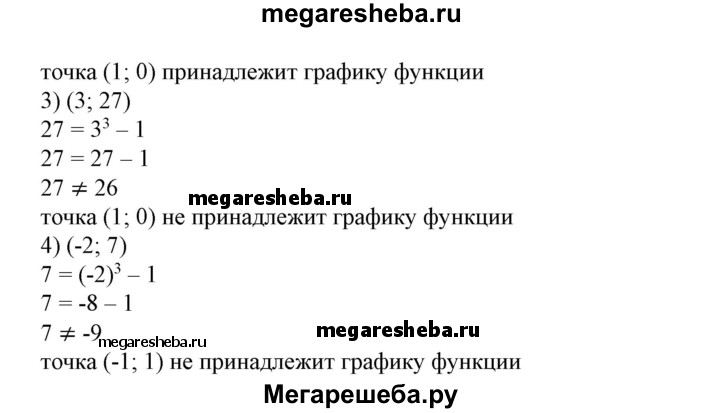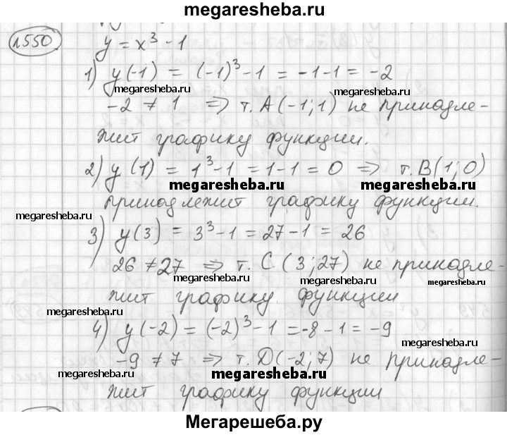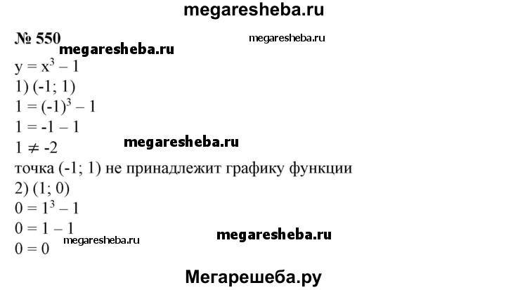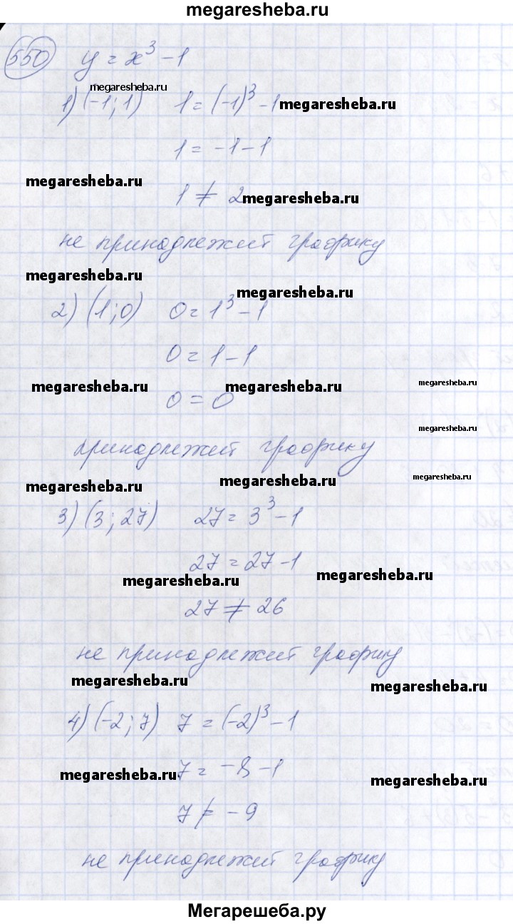 550 Дана функция у = х3-1. Выяснить, принадлежит ли графику этой функции точка с координатами: 1) (-1; 1); 2) (1; 0); 3) (3; 27); 4) (-2; 7).