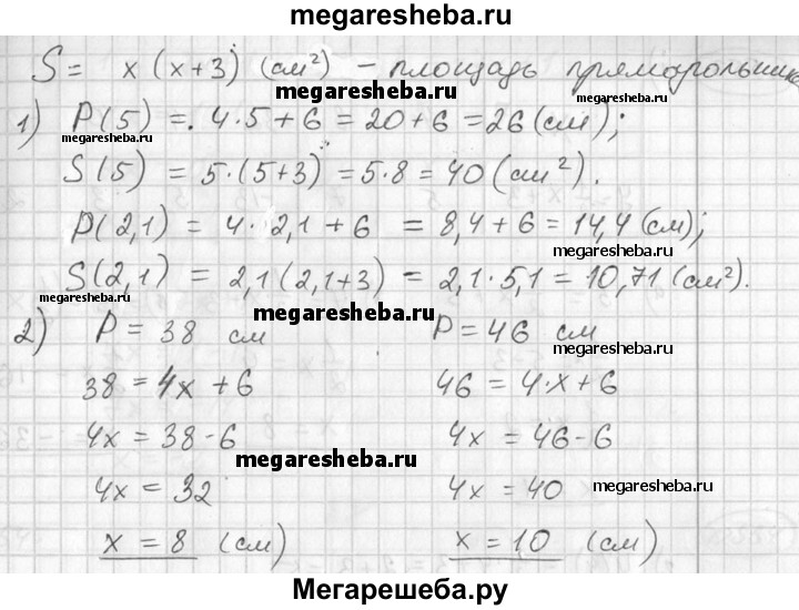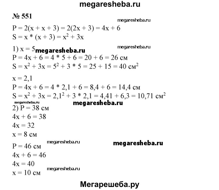 551 Одна сторона прямоугольника равна х см, другая сторона на 3 см больше. Записать формулы периметра Р и площади S этого прямоугольника. 1) Найти значение каждой из функций Р(х) и S (х) при х=5, х=2,1. 2) При каком значении х периметр этого прямоугольника будет равен 38 см, 46 см?