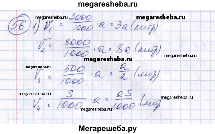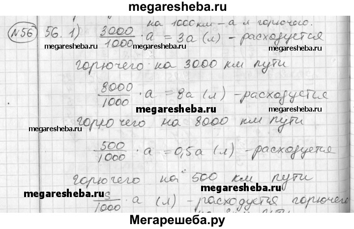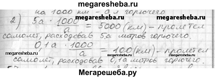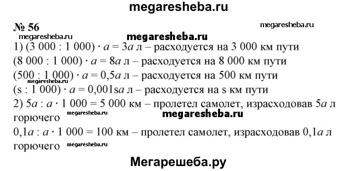 56. Реактивный самолет расходует а литров горючего на 1000 км пути. 1) Сколько литров горючего расходуется на 3000; 8000; 500; s километров пути? 2) Какой путь пролетел самолет, если он расходовал горючего 5а; 0,1а литров?