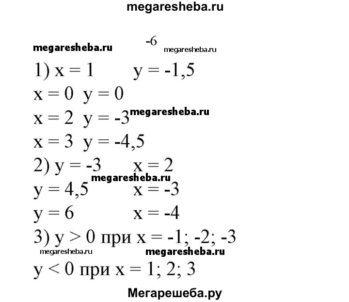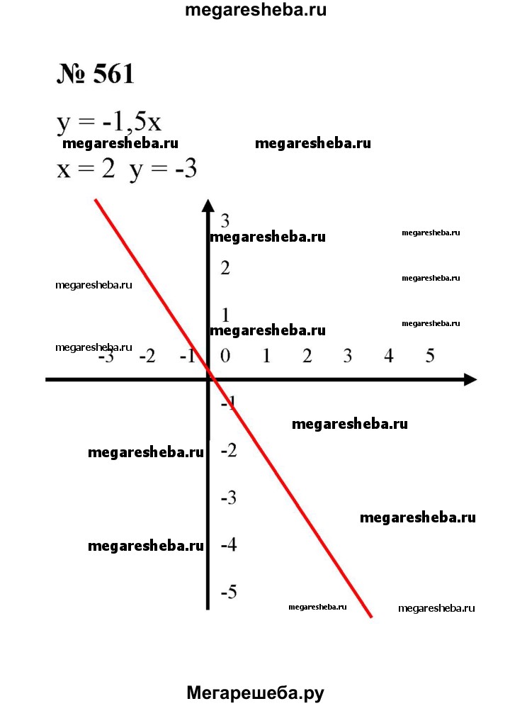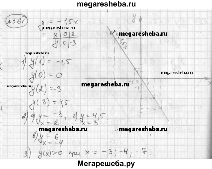 561 Построить график функции, заданной формулой у = -1,5х. Найти по графику: 1) значение у, соответствующее значению х, равному 1; 0; 2; 3; 2) значение х, если значение у равно -3; 4,5; 6; 3) несколько целых значений х, при которых значения у по-ложительны (отрицательны).