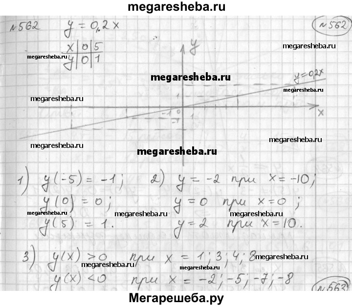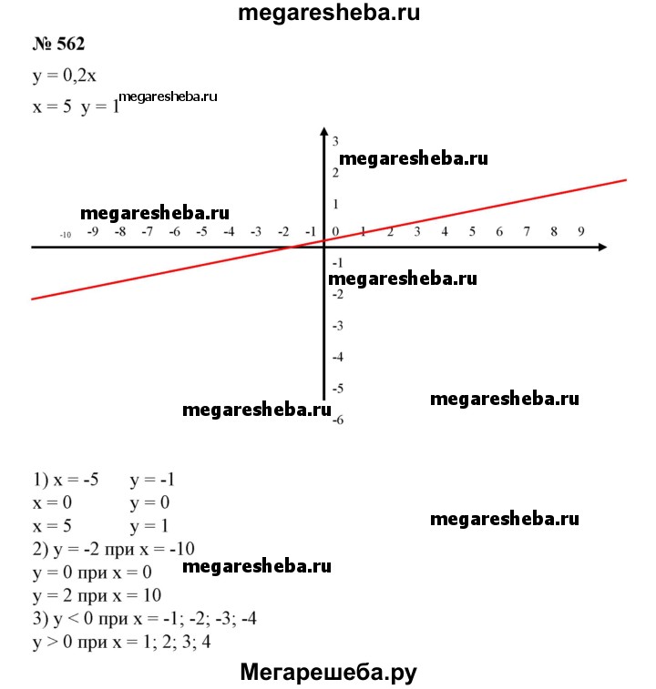 562 Построить график функции, заданной формулой у = 0,2х. Найти по графику: 1) значение у, соответствующее значению х, равному -5; 0; 5; 2) значение х, если значение функции равно -2; 0; 2; 3) несколько значений х, при которых значения у отрицательны (положительны).
