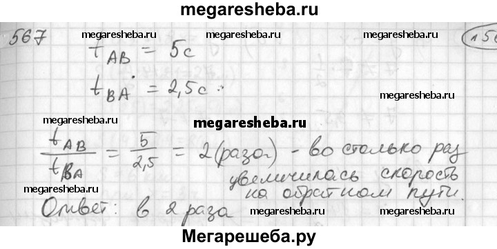567 Тело, двигаясь равномерно, прошло путь АВ за 5 с. Двигаясь обратно, оно увеличило скорость и прошло путь ВА за 2,5 с. Во сколько раз увеличилась скорость движения тела на обратном пути?