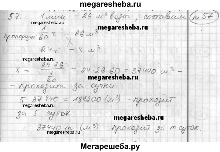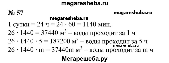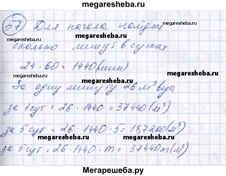 57. Для охлаждения доменной печи через ее стенки ежеминутно пропускается 26 кубометров воды. Сколько кубометров воды проходит через стенки доменной печи за одни сутки? за пять суток? за т суток?