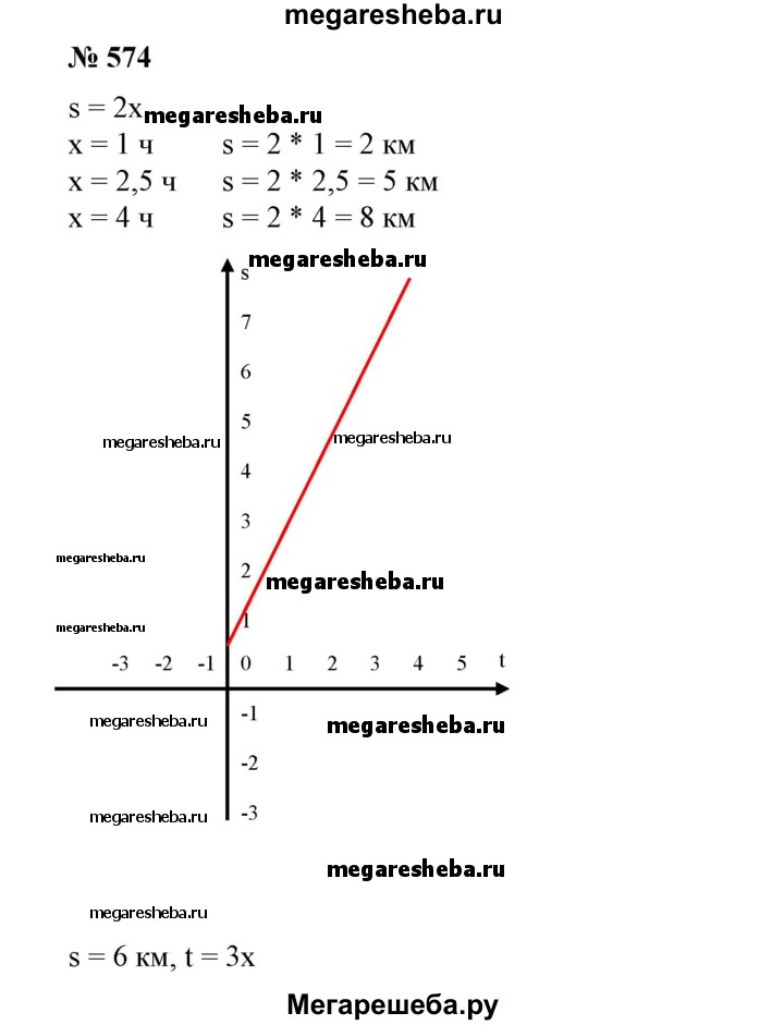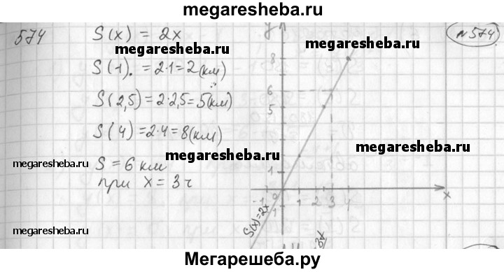 574 Плот плывет по реке со скоростью 2 км/ч. Выразить путь s, пройденный плотом за х часов. Вычислить путь, пройденный плотом за 1 ч, 2,5 ч, 4 ч. Построив график зависимости пути плота от времени движения, найти по графику время, за которое плот пройдет 6 км.