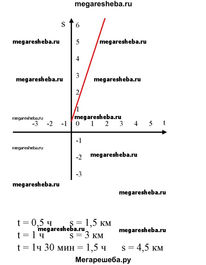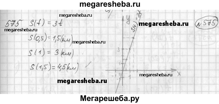 575 Пешеход идет со скоростью 3 км/ч. Выразить путь s, пройденный пешеходом за t часов. Построить график пути в зависимости от времени. Найти по графику путь, пройденный пешеходом за 0,5 ч, 1 ч, 1 ч 30 мин.