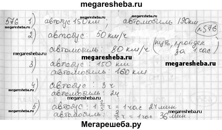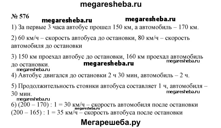 576 На рисунке 18 изображены графики движения автомобиля и автобуса. Используя рисунок, ответить на вопросы: 1) Какой путь прошел за первые 3 ч автобус? автомобиль? 2) Какой была скорость до остановки? 3) Какой путь прошла каждая из автомашин до остановки? 4) Сколько времени двигался до остановки автобус? автомобиль? 5) Какой была продолжительность стоянки автобуса и автомобиля? 6) Какой стала скорость движения автобуса и автомобиля после остановки?