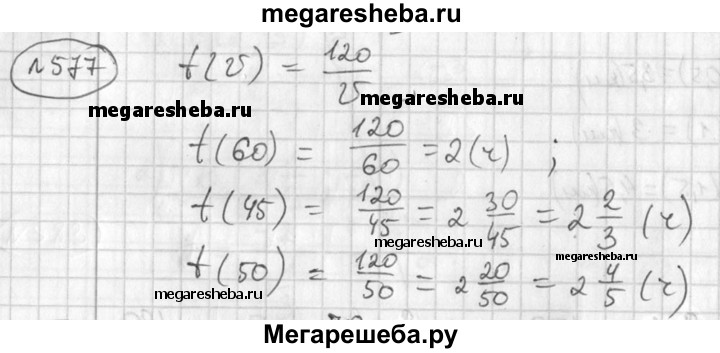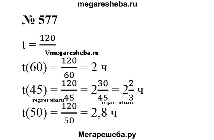 577 Двигаясь равномерно, автомобиль прошел путь в 120 км. Записать формулу зависимости времени движения t от его скорости v (в км/ч). Найти t (60); t (45); t (50).