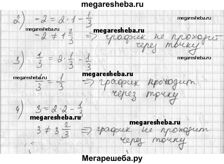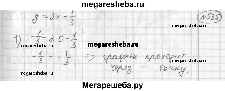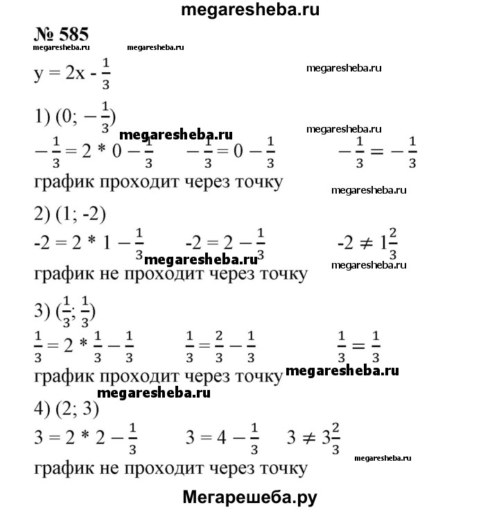 585 Не выполняя построения графика функции y = 2x-1/3, выяснить, проходит ли он через точку: 1) (0; -1/3) 2) (1; -2); 3) (1/3; 1/3); 4) (2; 3).
