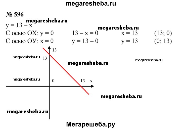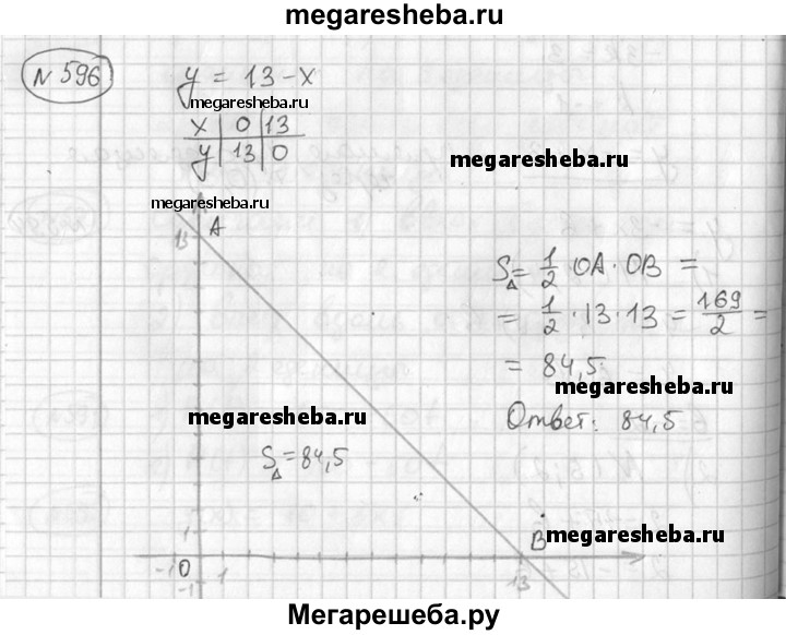 596 Определить координаты точек пересечения с осями координат графика функции у = 13-х и вычислить площадь прямоугольного треугольника, ограниченного этой прямой и координатными осями.
