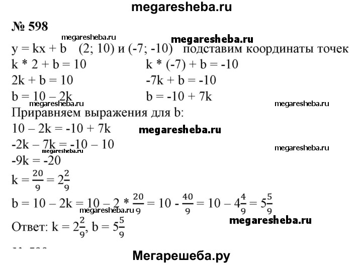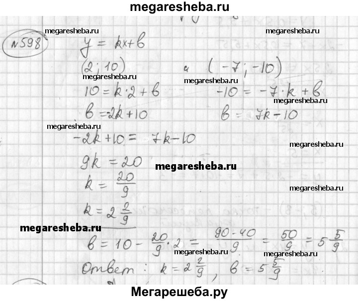 598 Найти значения k и b, если известно, что график функции y=kx + b проходит через точки (2; 10) и (-7; -10).