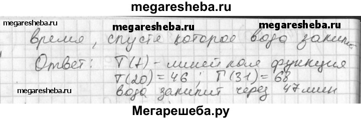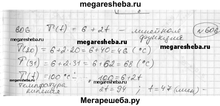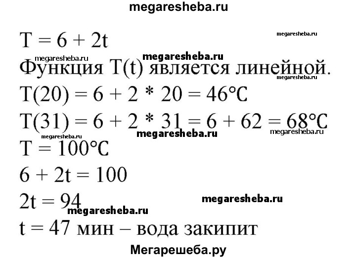 606 При начале нагревания вода в кипятильнике имела температуру 6 °С. При нагревании температура воды повышалась каждую минуту на 2 °С. Найти формулу, выражающую изменение температуры Т воды в зависимости от времени t (в минутах) ее нагревания. Будет ли функция T(t) линейной? Чему равны Т(20), Т(31)? Через сколько минут после начала нагревания вода закипит?