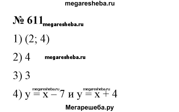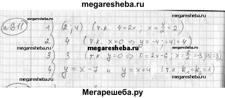 611 Заполнить пропуски в тексте: 1) прямая у = 2х проходит через точку (...; 4); 2) прямая у = 3х- 4 отсекает на оси ординат от ее начала отрезок длиной ... ; 3) прямая y = 2х-6 отсекает на оси абсцисс от ее начала отрезок длиной ... ; 4) среди прямых у = х-7, у = 5х + 2, у = Зх-7, у = х + 4, у = -х-1 параллельными являются ... .