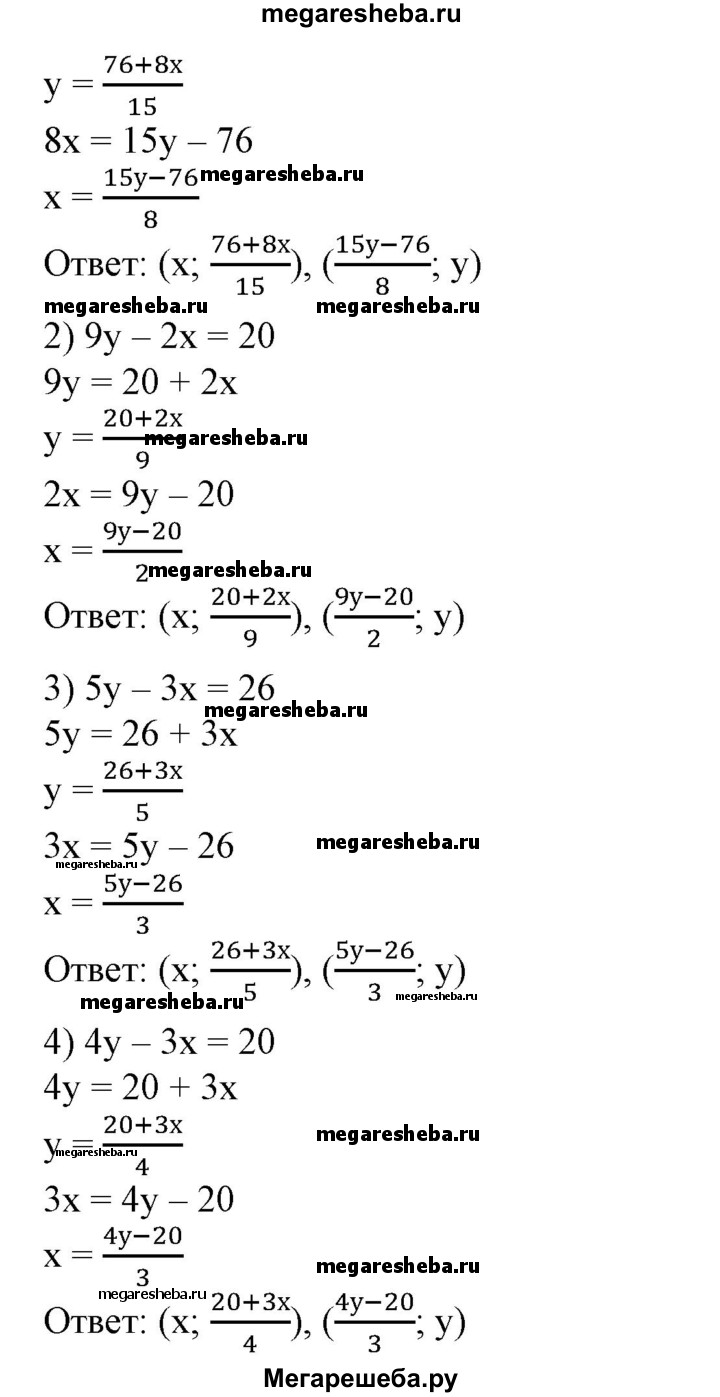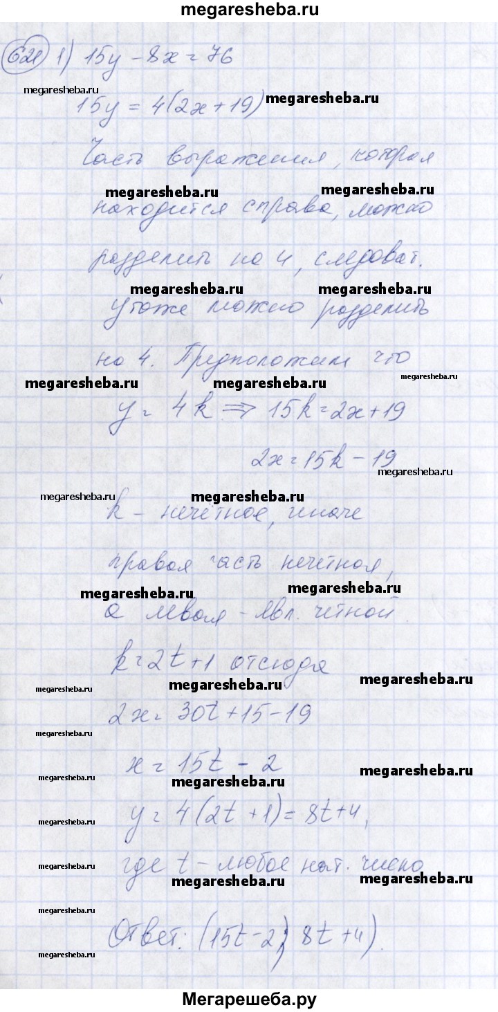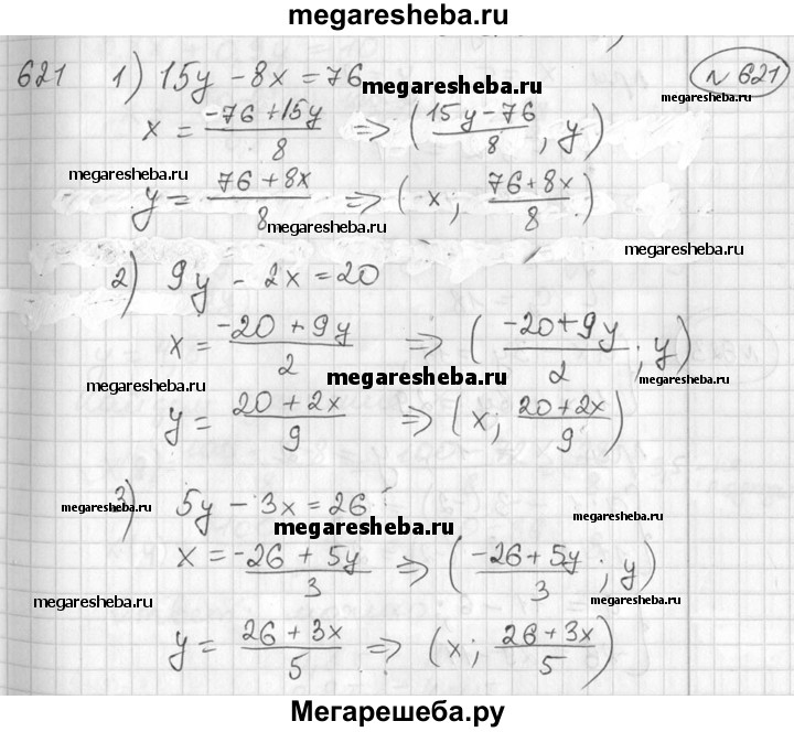 621 Найти все пары (х; у) натуральных чисел, которые являются решениями уравнения: 1) 15у-8х = 76; 2) 9y-2x = 20; 3) 5у-Зх = 26; 4) 4у-3х = 20.