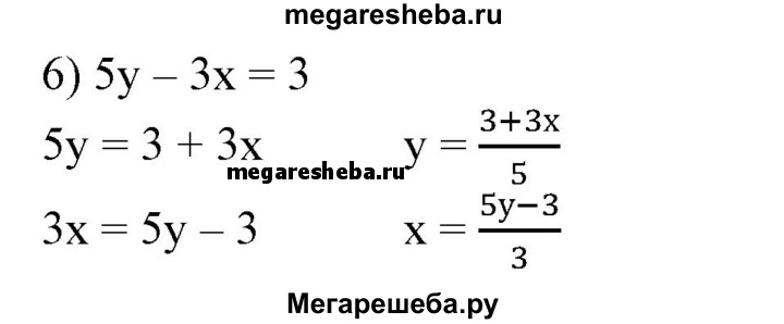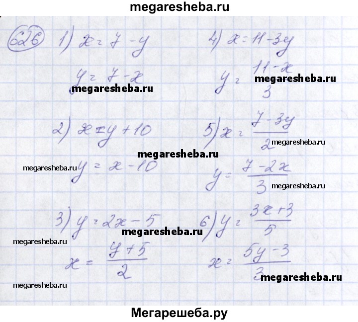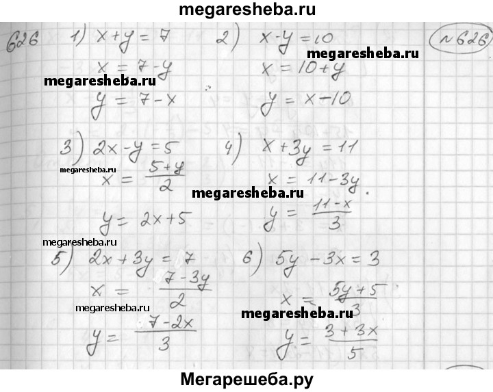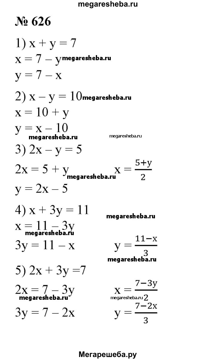 626 В каждом из уравнений выразить одно неизвестное через другое: 1) х+у = 7; 2) х-у= 10; 3) 2х-у = 5; 4) х + 3у = 11; 5) 2х + 3у = 7; 6) 5у-3х = 3.