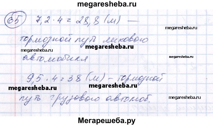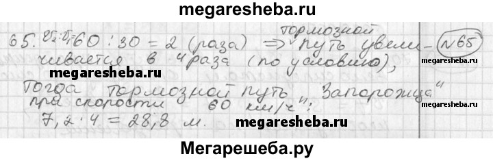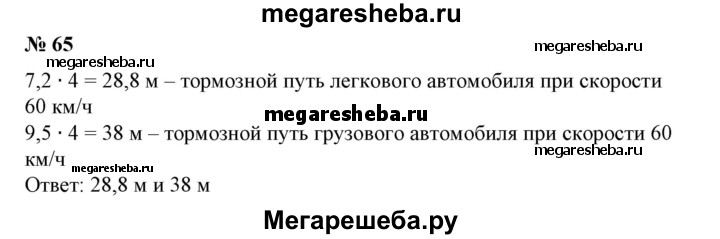 65 При увеличении скорости движения автомобиля вдвое его тормозной путь увеличивается в 4 раза. При скорости 30 км/ч тормозной путь «Запорожца» равен 7,2 м, а грузового автомобиля — 9,5 м. Найти тормозной путь этих автомобилей при скорости 60 км/ч.