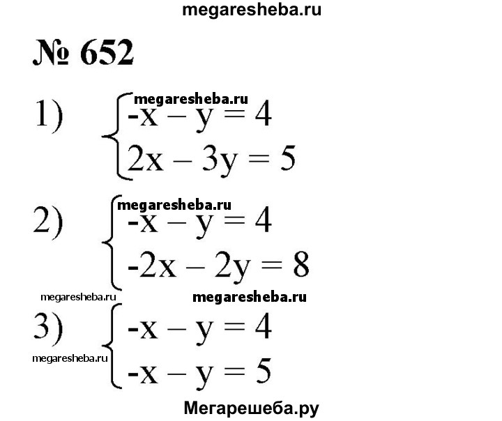 652 Составить такое линейное уравнение с двумя неизвестными, чтобы оно вместе с уравнением -х-у = 4 образовало систему: 1) имеющую единственное решение; 2) имеющую бесконечно много решений; 3) не имеющую решений. Задача 1 Расстояние между двумя пристанями на реке равно 60 км. Это расстояние катер проходит по течению реки за 2 ч, а против течения за 3 ч. Найти собственную скорость движения катера и скорость реки. Задача 2 Найти два числа, если удвоенная сумма этих чисел на 5 больше их разности, а утроенная сумма этих чисел на 8 больше их разности. Задача 3 Два карандаша и три тетради стоят 35 р., а три карандаша и две тетради стоят 40 р. Сколько стоят пять карандашей и шесть тетрадей?