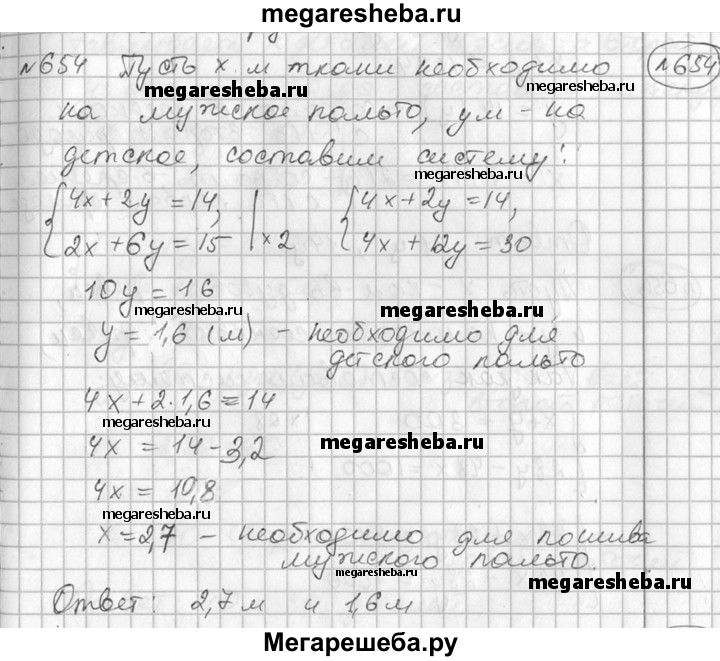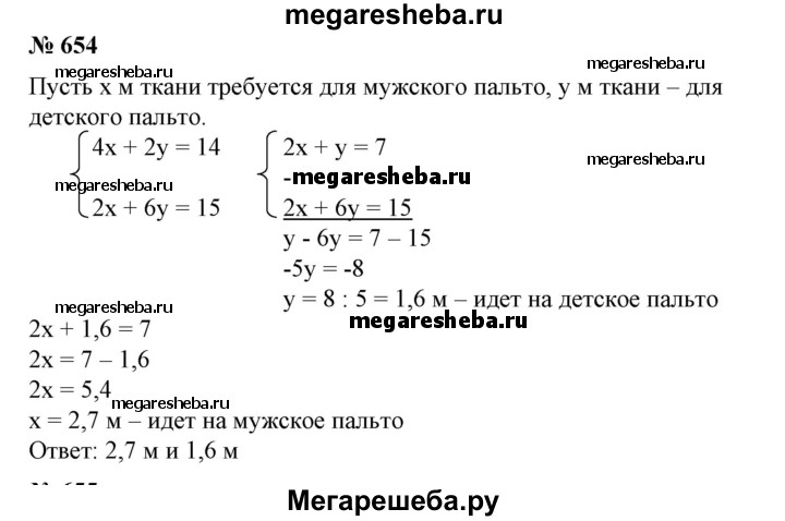 654 Из 14 м ткани можно сшить 4 мужских и 2 детских пальто. Сколько метров ткани необходимо для пошива одного мужского и одного детского пальто, если из 15 м той же ткани можно сшить 2 мужских и 6 детских пальто?