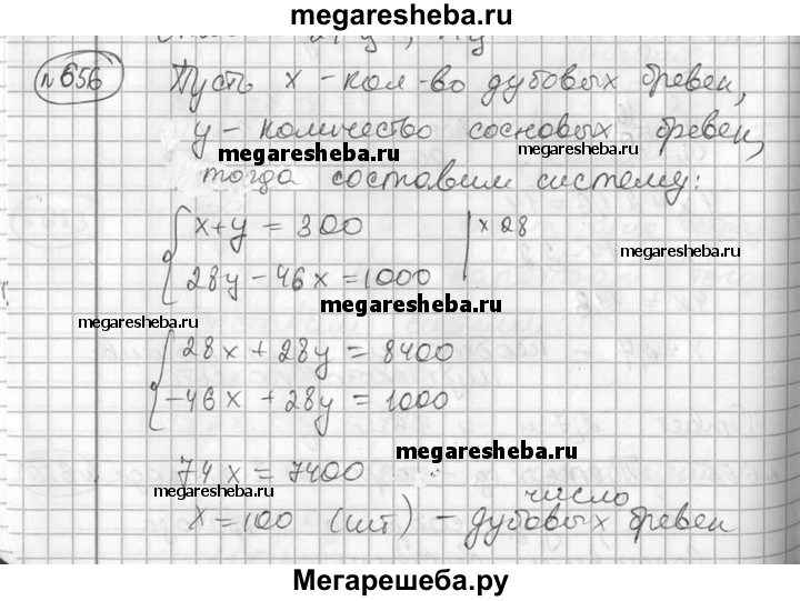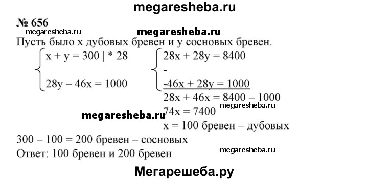 656 На платформу были погружены дубовые и сосновые бревна, всего 300 бревен. Известно, что все дубовые бревна весили на 1т меньше, чем все сосновые. Определить, сколько было дубовых и сосновых бревен отдельно, если каждое бревно из дуба весит 46 кг, а каждое сосновое бревно — 28 кг.