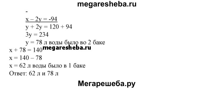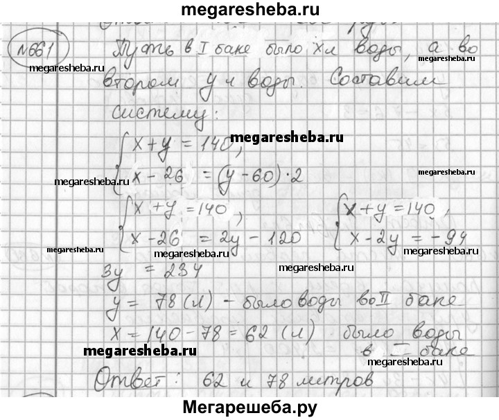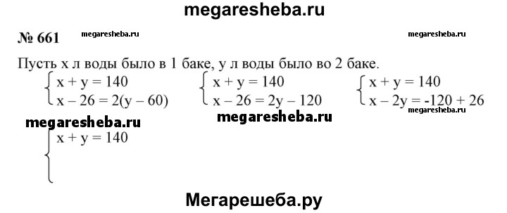 661 В двух баках содержалось 140 л воды. Когда из первого бака взяли 26 л воды, а из второго — 60 л, то в первом баке осталось в 2 раза больше воды, чем во втором. Сколько литров воды было в каждом баке первоначально?