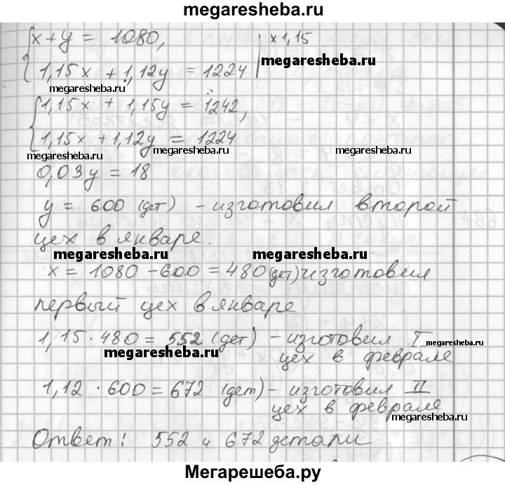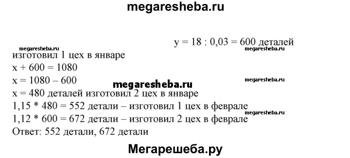 666 В январе два цеха изготовили 1080 деталей. В феврале первый цех увеличил выпуск деталей на 15%, второй — на 12%, оба цеха изготовили 1224 детали. Сколько деталей изготовил в феврале каждый цех?