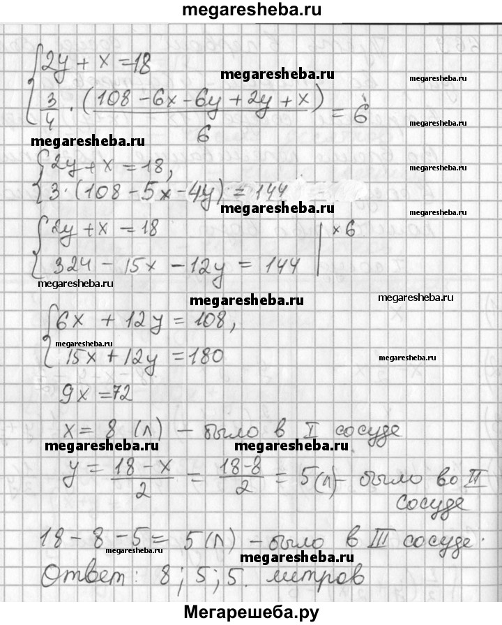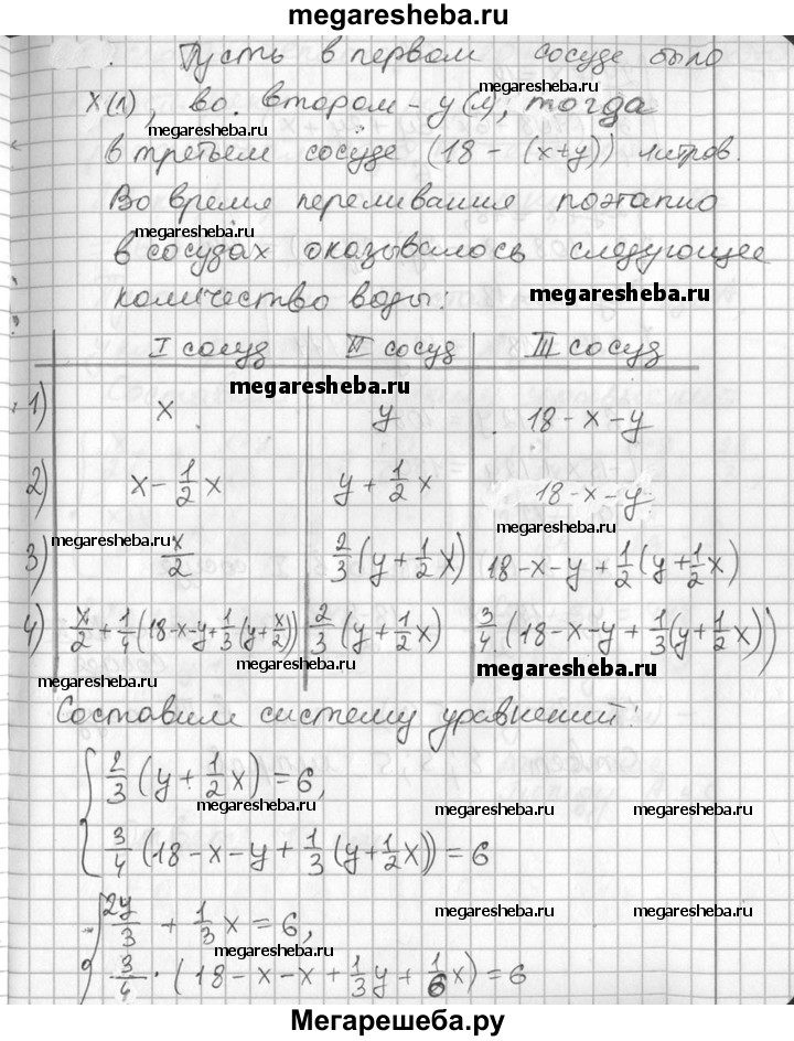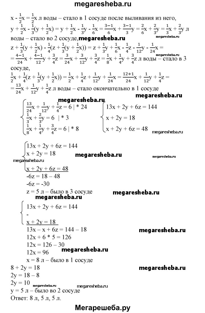 669 В три сосуда налита вода. Если половину воды из первого сосуда перелить во второй, затем 1/3 часть воды, оказавшейся во втором сосуде, перелить в третии и, наконец, 1/4 часть воды, оказавшейся в третьем сосуде, перелить в первый, то в каждом сосуде станет по 6 л. Сколько воды было в каждом сосуде до переливания?