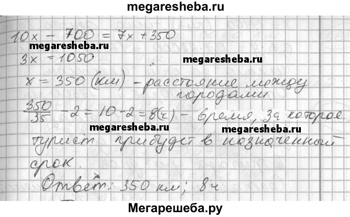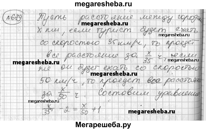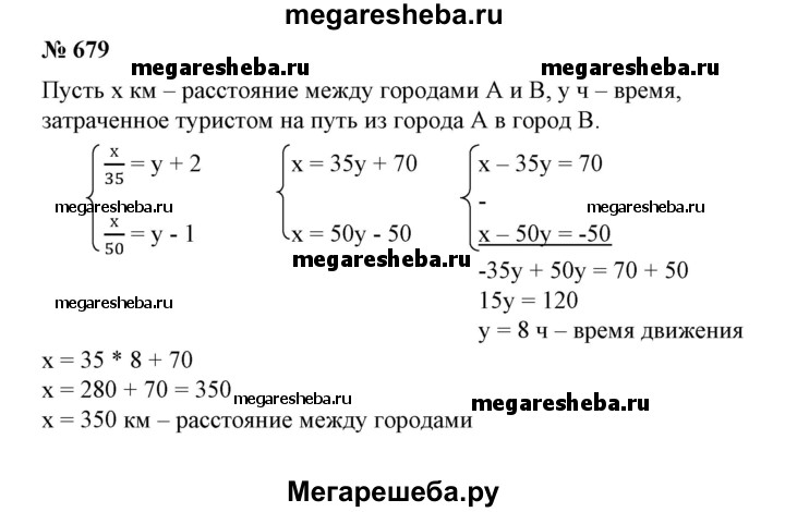 679 Турист выехал из города А и должен приехать в город В в на-значенный срок. Если он будет ехать со скоростью 35 км/ч, то опоздает на 2 ч; если же он будет ехать со скоростью 50 км/ч, то приедет на час раньше срока. Определить расстояние между городами А и В и время, затраченное туристом на путь из города А в город В, если он прибыл в назначенный срок.