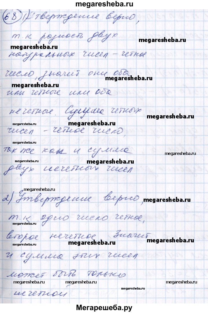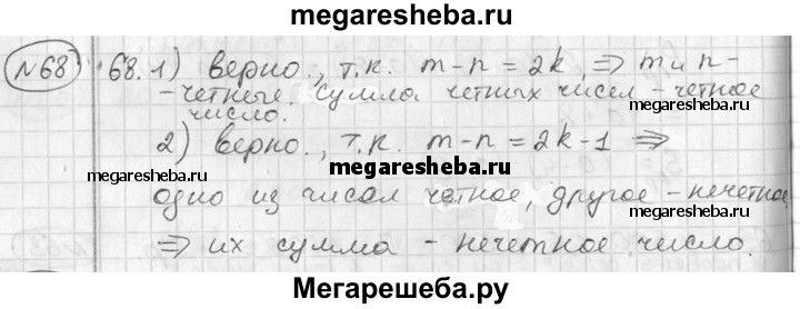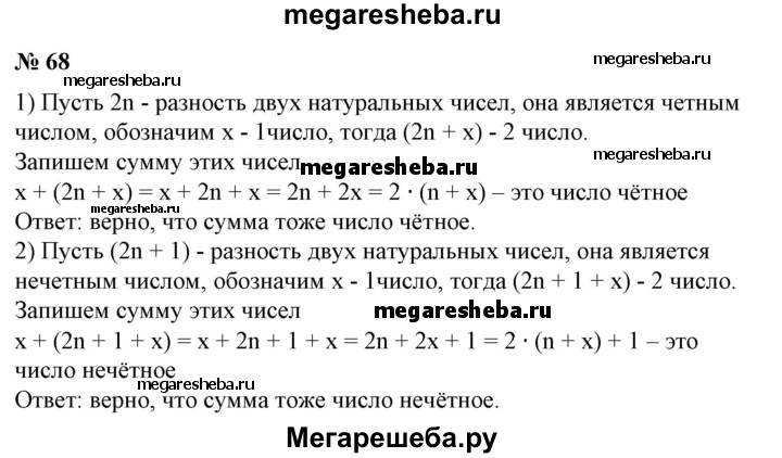 68 Верно ли утверждение: 1) если разность двух натуральных чисел - четное число, то их сумма также число четное; 2) если разность двух натуральных чисел - нечетное число, то их сумма также число нечетное?