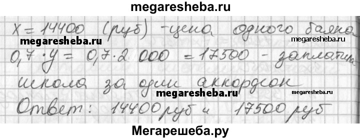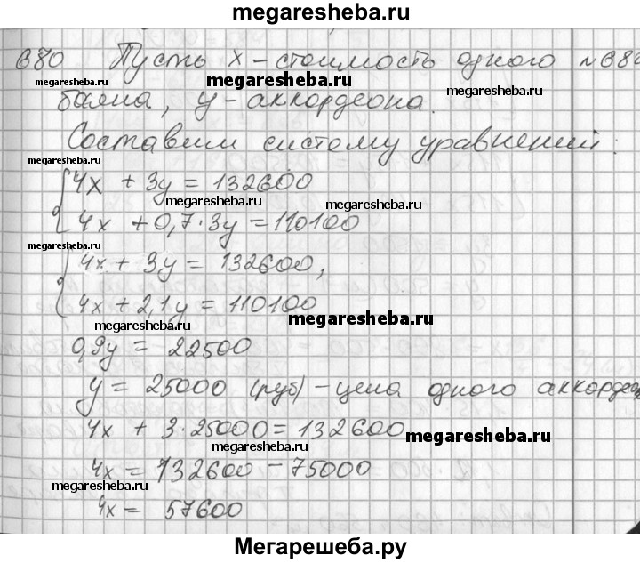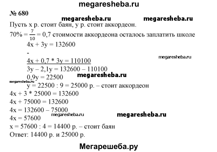 680 Для детской музыкальной школы решили приобрести 4 баяна и 3 аккордеона на сумму 132600 р. Спонсор оплатил 30% стоимости каждого аккордеона, и школе осталось заплатить 110100 р. Сколько денег заплатила школа за каждый баян и аккордеон?