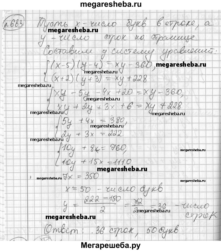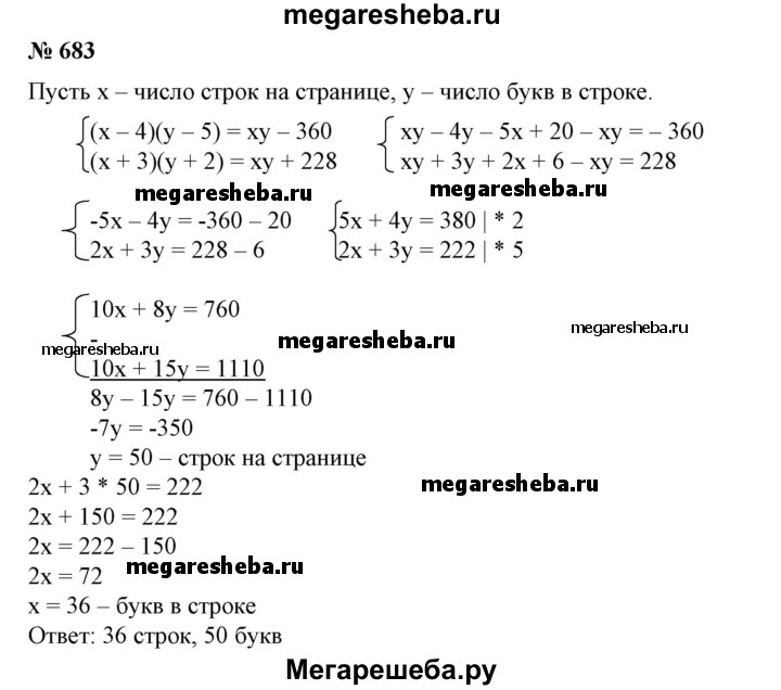 683 Во всех строках некоторой страницы книги одинаковое число букв. Если на этой странице уменьшить число строк на 4, а число букв в строке на 5, то число букв на всей странице уменьшится на 360. Если же на странице увеличить число строк на 3, а число букв в строке на 2, то на странице поместится на 228 букв больше, чем было. Определить число строк и число букв в строке на этой странице книги