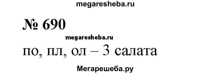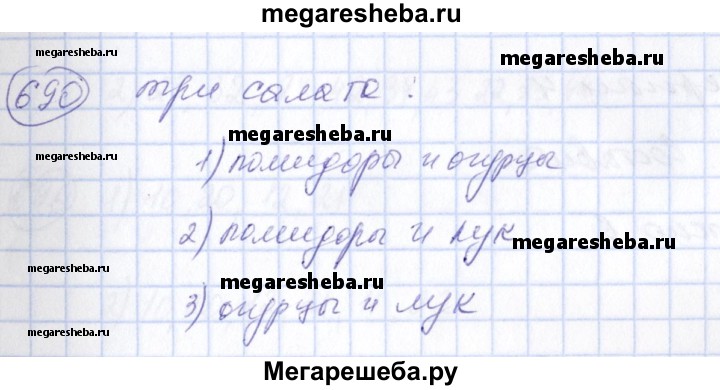 690 Имеются помидоры (п), огурцы (о) и лук (л). Сколько различных салатов можно приготовить, если в каждый из них должны входить в равных долях 2 различных вида овощей? Записать все сочетания овощей в составляемых салатах.