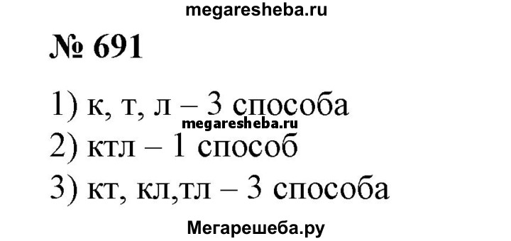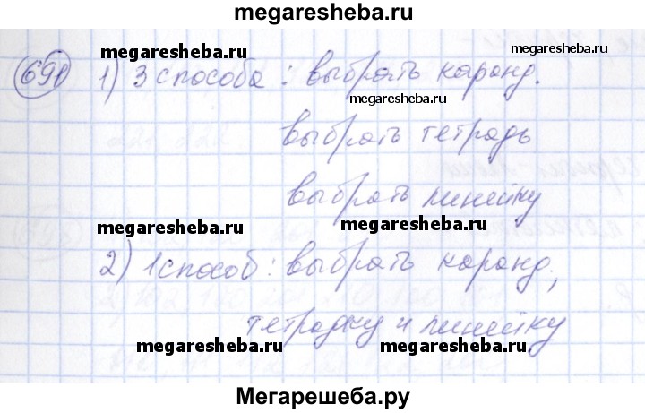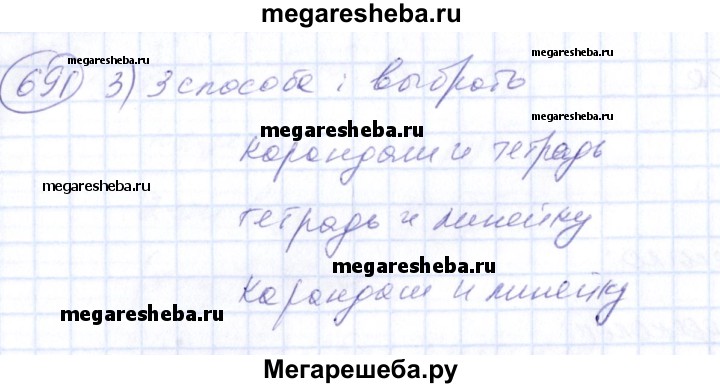 691 Имеются 3 предмета: карандаш, тетрадь и линейка. Сколькими способами из этих канцелярских принадлежностей можно выбрать: 1) один предмет; 2) 3 предмета; 3) 2 предмета?