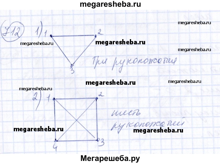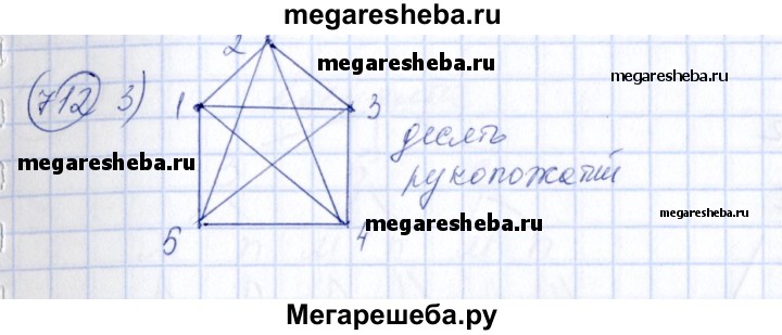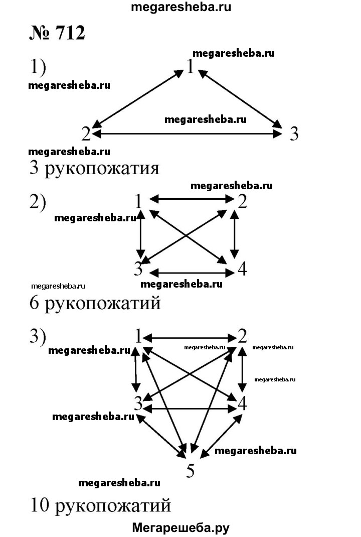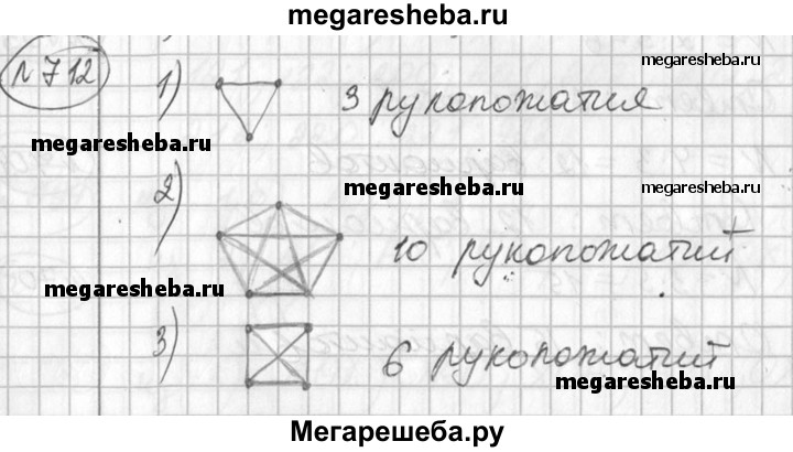 712 При встрече каждый из друзей пожал другому руку (каждый пожал каждому). Сколько рукопожатий было сделано, если друзей было: 1) трое; 2) четверо; 3) пятеро?