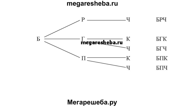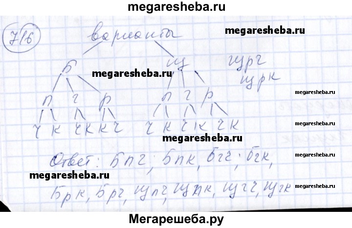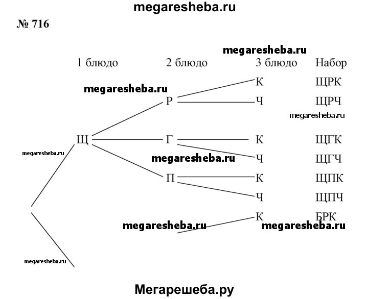 716 Перечислить все возможные варианты обедов из трех блюд (одного первого, одного второго и одного третьего блюда), если в меню столовой имеются два первых блюда: щи (щ) и борщ (б); три вторых блюда: рыба (р), гуляш (г) и плов (п); два третьих: компот (к) и чай (ч).