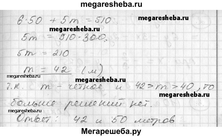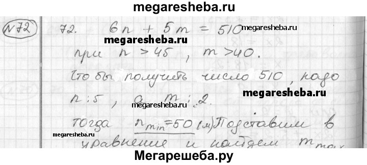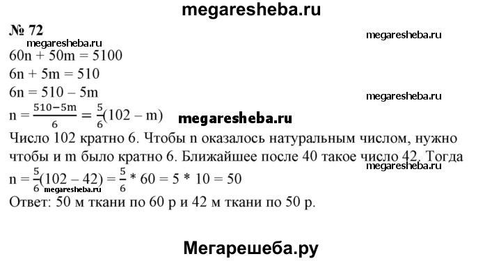 72 В магазин привезли л метров ткани по 6 р. за метр и т метров ткани по 5 р. за метр — всего на сумму 510 р. Сколько метров ткани по 5 р. и по 6 р. привезли в магазин (n и m — натуральные числа), если n > 45, m > 40?