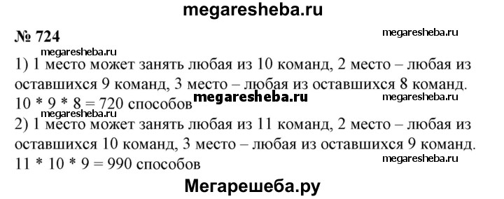 724 Сколько существует способов занять 1, 2 и 3-е места на чемпионате по футболу, в котором участвуют: 1) 10 команд; 2) 11 команд?