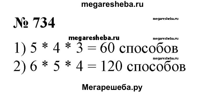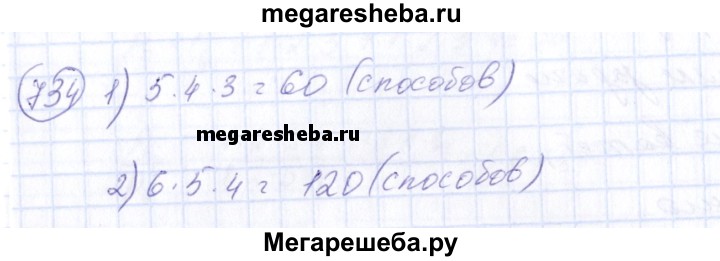 734 Сколькими способами могут быть заняты первое второе и третье места (по одному человеку на место) на соревнованиях, в которых участвуют: 1) 5 человек; 2) 6 человек. Сколькими различными способами можно назначить двух ребят на дежурство по столовой, если в классе: 1) 24 учащихся; 2) 25 учащихся?