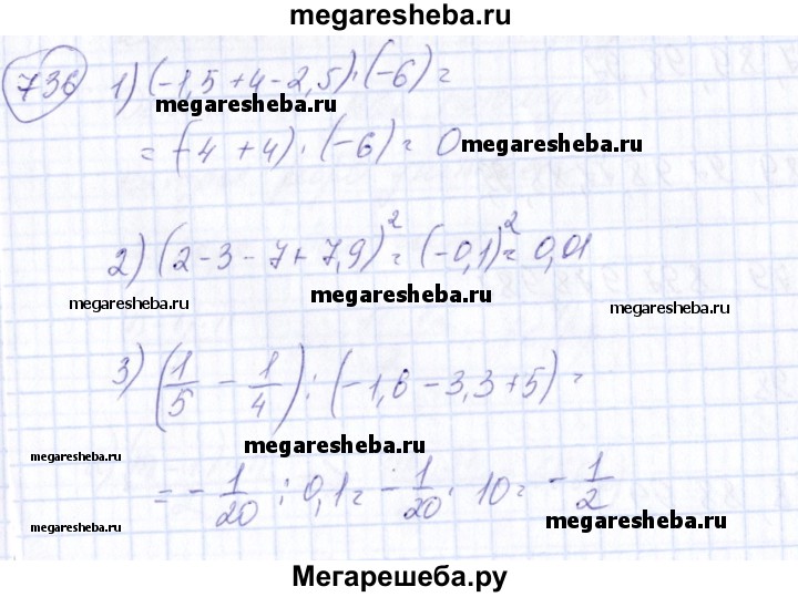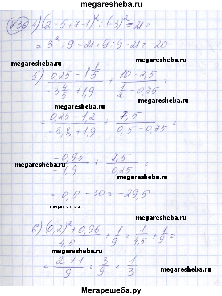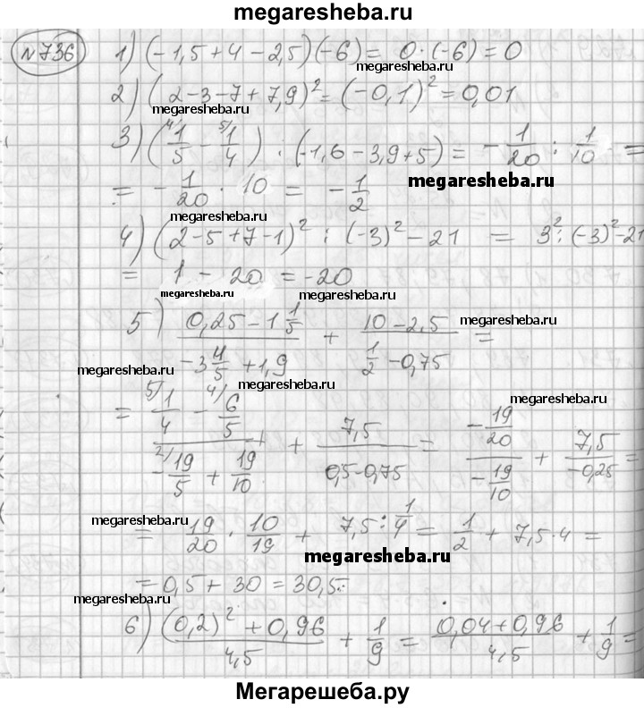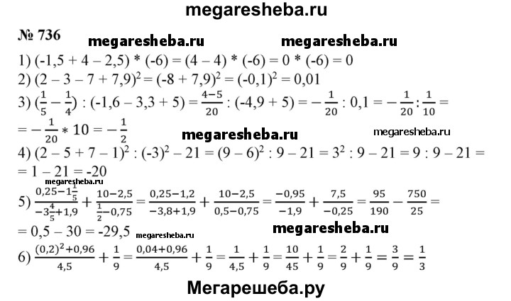 736 Найти значение числового выражения: 1) (-1,5 + 4-2,5)(-6); 2) (2-3-7 + 7,9)2; 3) (1/5 – 1/4):(-1,6-3,3 + 5); 4) (2-5+7-1)2: (-3)2 - 21;