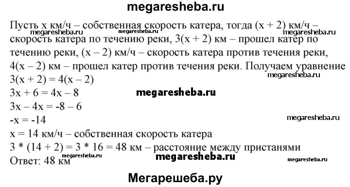 747 Катер прошел расстояние между двумя пристанями по течению реки за 3 ч, а против течения за 4 ч. Каково расстояние между этими пристанями, если скорость течения реки 2 км/ч?